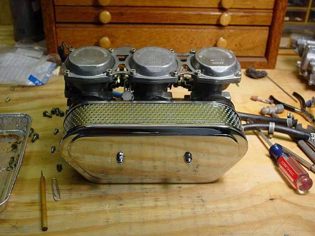 3-1 air filter installed on the bench and a 1977 Yamaha XS750-2D